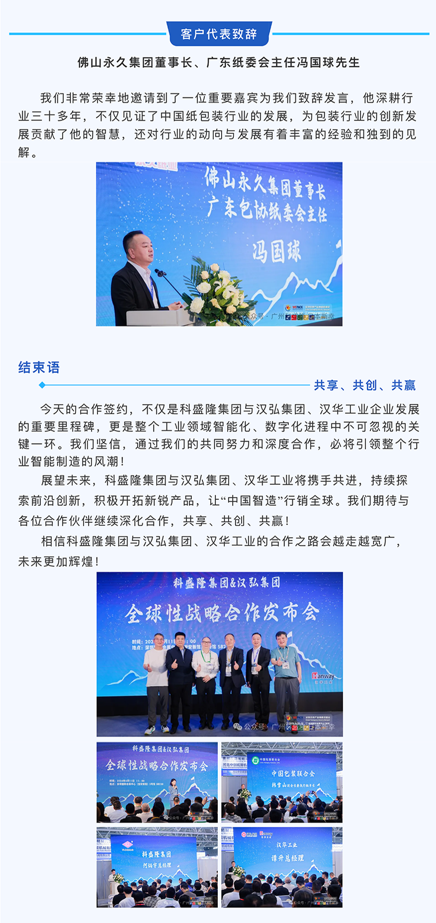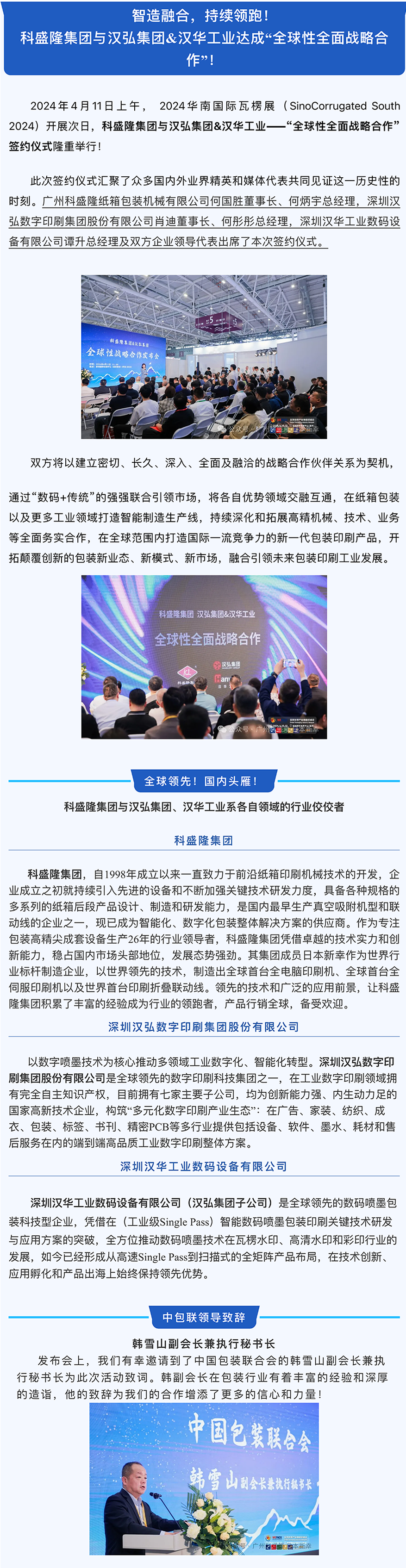 【概要描述】2024年4月11日上午, 2024華南國際瓦楞展(SinoCorrugated South 2024)開展次日,科盛隆集團與漢弘集團&漢華工業(yè)——“全球性全面戰(zhàn)略合作”簽約儀式隆重舉行!
